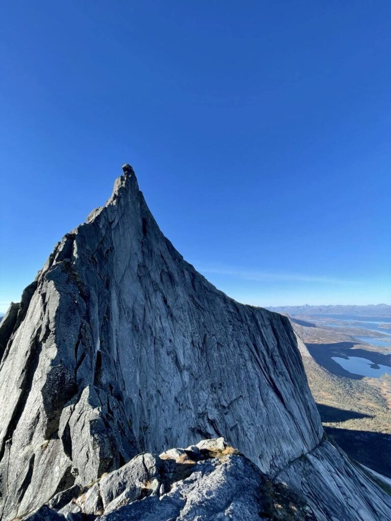 Stetind er Norges nasjonalfjell og ruver 1392 meter over havet. I 1910 ble toppen besteget for første gang. Idag er fjellet ettertraktet i klatremiljøet for sin gode steinkvalitet og tillater flere ruter til toppen. Vi tilbyr føringsturer opp to av ruten for deg som ønsker å nå toppen av Stetind.
